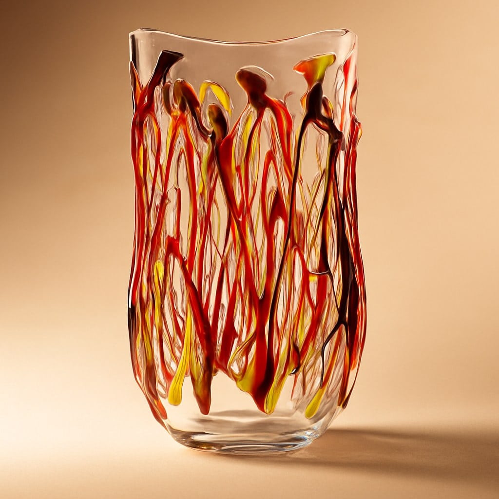 The Fiamma di vetro vase is a dramatic expression of Murano glass artistry, evoking the beauty of fire and dawn within its flowing form. Hand-blown by skilled Italian artisans, the clear glass body is streaked with molten ribbons of red, amber, and golden yellow, creating the effect of flames dancing upward through the vessel.